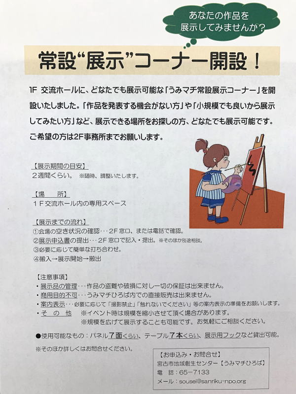 うみマチひろばでは、どなたでも展示可能な「うみマチアートスペース(常設展示コーナー)」を開設しております。
