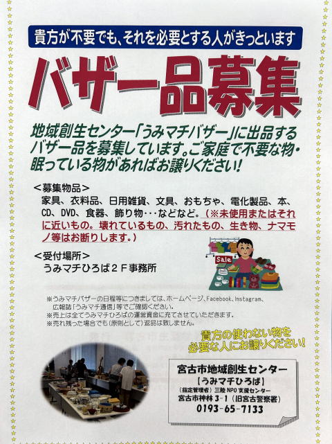 うみマチひろば(宮古市地域創生センター)で開催している「うみマチバザー」のバザー品を募集しています。